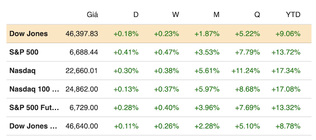 Kết thúc phiên giao dịch ngày 30/09, chỉ số S&P 500 tiến 0.41% lên 6,688.46 điểm, còn chỉ số Nasdaq Composite cộng 0.31% lên 22,660.01 điểm. Chỉ số Dow Jones tăng 81.82 điểm (tương đương 0.18%) lên 46,397.89 điểm, mức đóng cửa cao kỷ lục.