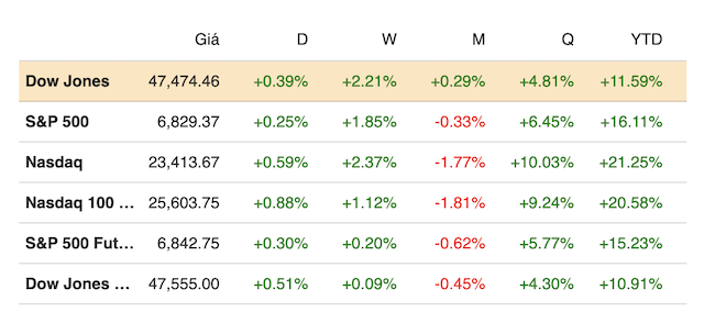 Kết thúc phiên giao dịch ngày 02/12, chỉ số Dow Jones tăng 185.13 điểm (tương đương 0.39%) lên 47,474.4 điểm. Chỉ số S&P 500 cộng 0.25% lên 6,829.37 điểm, còn chỉ số Nasdaq Composite tiến 0.59% lên 23,413.67 điểm.