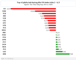 Trong tuần giao dịch 2.3-6.3, VN Index ghi nhận mức giảm mạnh hơn 110 điểm và xóa bỏ gần hết thành quả của hai tuần tăng điểm trước đó. Biến động về xung đột vũ trang ở Trung Đông là một trong những nguyên nhân ảnh hưởng chính tới tâm lý thị trường trong tuần. Vận động tiêu cực ở phần lớn các nhóm ngành có vốn hóa lớn như nhóm Vingroup, ngân hàng, bán lẻ, công nghệ, đã tạo áp lực lớn khiến chỉ số chung liên tục trượt điểm về vùng đáy cũ ở khu vực 1750-1770. Tuy nhiên, một số nhóm ngành được hưởng lợi từ tình hình bất ổn địa chính trị như Dầu khí, Phân đạm ghi nhận vận động khá tích cực so với phần còn lại của thị trường. Thanh khoản tuần chứng kiến sự gia tăng khi tổng khối lượng giao dịch tăng khoảng 35% so với tuần đầu sau Tết. Khối ngoại tiếp tục là một điểm trừ khi trong tuần vừa rồi, tổng khối lượng bán ròng của khối ngoại đạt 3500 tỷ đồng, tập trung vào các mã như FPT, VNM và VHM.