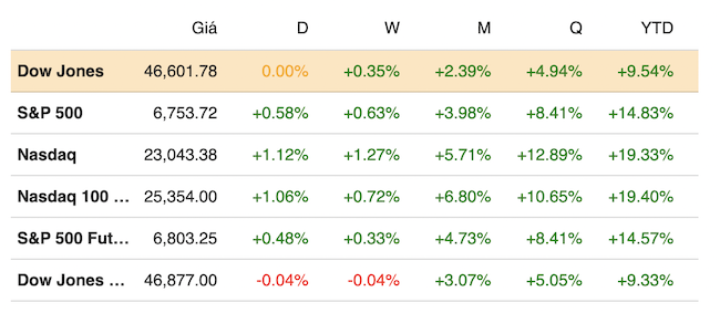 Kết thúc phiên giao dịch ngày 08/10, chỉ số S&P 500 tiến 0.58% lên 6,753.72 điểm, được hỗ trợ bởi đà tăng của các lĩnh vực công nghệ thông tin, tiện ích và công nghiệp. Cả 3 lĩnh vực này đều đạt mức cao kỷ lục mới. Chỉ số Nasdaq Composite cộng 1.12% lên 23,043.38 điểm. Trong khi, chỉ số Dow Jones mất 1.20 điểm còn 46,601.78 điểm.