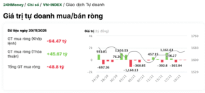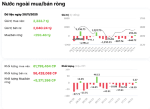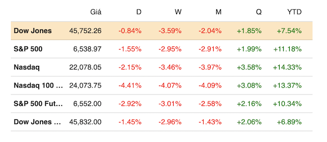 Kết thúc phiên giao dịch ngày 20/11, chỉ số Dow Jones lùi 386.51 điểm (tương đương 0.84%) xuống 45,752.26 điểm, sau khi vọt hơn 700 điểm tại mức đỉnh trong phiên. Chỉ số S&P 500 mất 1.56% còn 6,538.76 điểm, mặc dù đã tăng 1.9% vào đầu phiên. Chỉ số Nasdaq Composite rớt 2.1