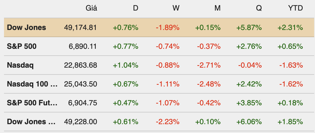 Khép phiên ngày 24/02, chỉ số S&P 500 tăng 0.77% lên 6,890.07 điểm, Nasdaq Composite tăng 1.04% lên 22,863.68 điểm. Dow Jones tăng 370.44 điểm, tương đương 0.76%, lên 49,174.50 điểm.