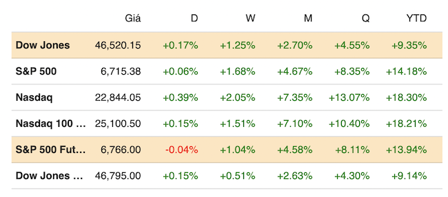 Kết thúc phiên giao dịch ngày 02/10, chỉ số S&P 500 nhích 0.06% lên 6,715.35 điểm. Chỉ số này đã tăng 0.3% tại mức đỉnh trong phiên, ghi nhận mức cao mọi thời đại mới trong phiên. Chỉ số Dow Jones tiến 78.62 điểm (tương đương 0.17%) lên 46,519.72 điểm, còn chỉ số Nasdaq Composite cộng 0.39% lên 22,844.05 điểm.