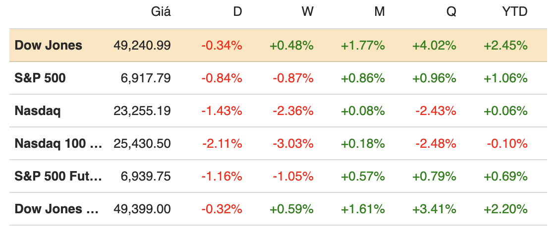 Khép phiên ngày 03/02, chỉ số S&P 500 giảm 0.84%, đóng cửa tại 6,917.81 điểm. Chỉ số Dow Jones giảm 166/67 điểm, tương đương 0.34%, xuống 49,240.99 điểm, dù trước đó trong phiên đã có lúc tăng tới 0.5% và chạm mốc kỷ lục 49,653.13 điểm. Nasdaq Composite giảm mạnh nhất, mất 1.43% và kết phiên ở 23,255.19 điểm.